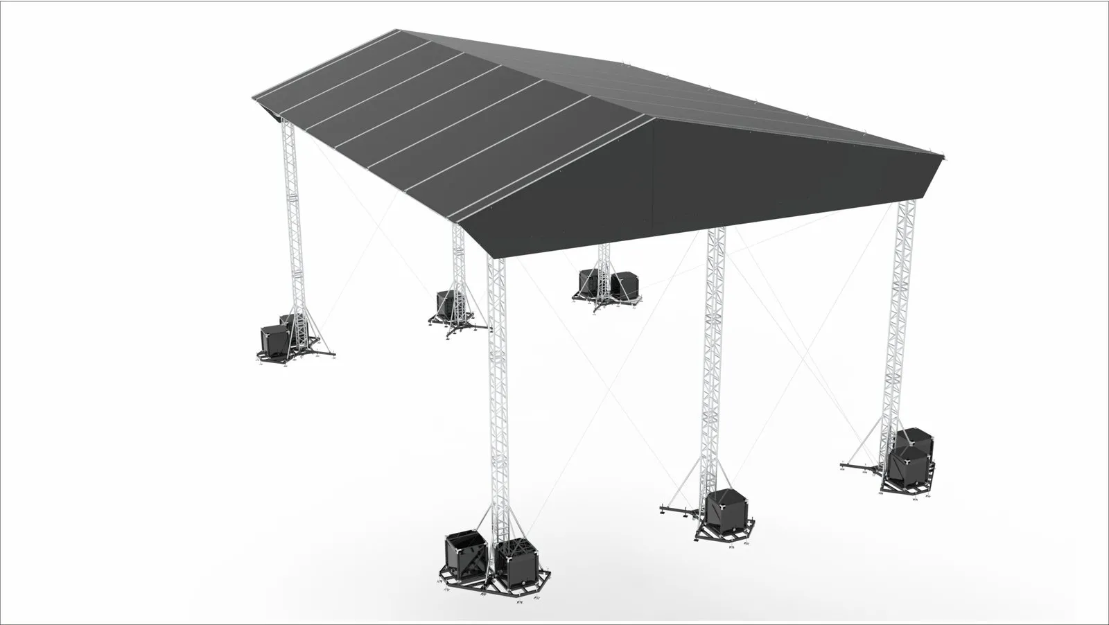 is made from the JTX / EX truss system & allows a span of 24 mtrs without the roof and 18 mtrs with the roof. The area covered by the roof truss is