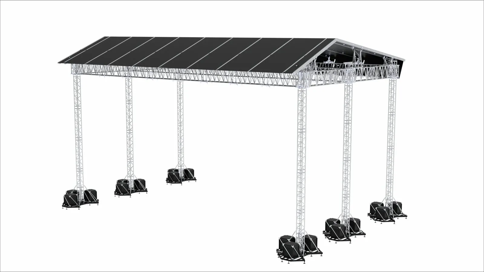 special tent proles with integrated keder proles. The DDR85 Roof is a tower based structure with a pitched roof. This pitched roof has a standard cantilever and PA truss at the sleeve blocks of the front towers which can carry a PA Load of 2,000 kg (4,400 lbs) each and is a working platform to slide in the outer keder canopy. This is a result of the fact that the towers are positioned under the roof structure in order to have a fully closed rooftop. You can choose to include PA Wings, Side Houses, Back Storage,